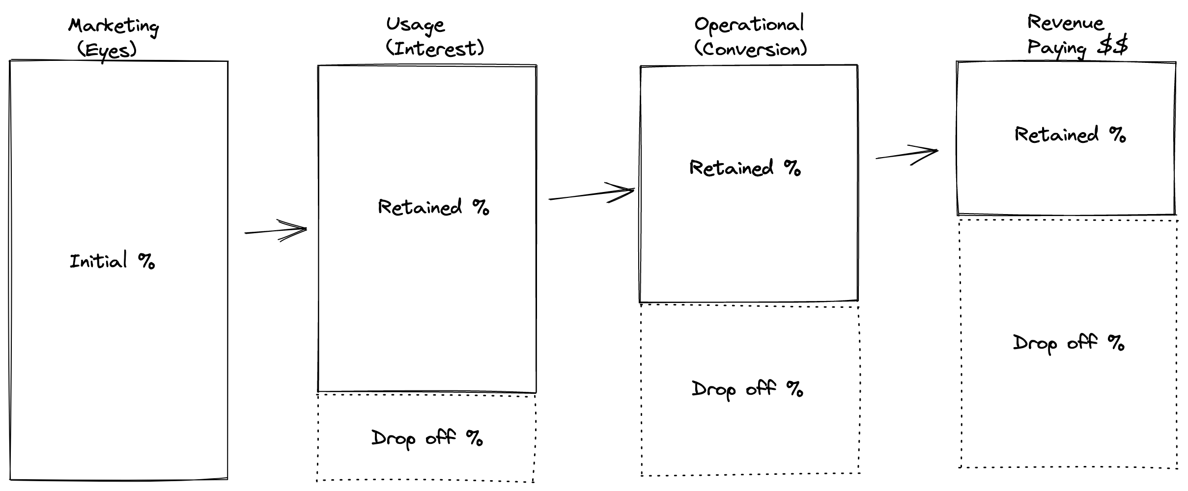 Flipping this diagram illustrates another common way to understand acquisition, where revenue exists at the end of the acquisition Funnel. Potential or current users encounter your product, something about your brand stirs their interesting, they eventually convert, and hopefully they end up paying you as testament to your product providing them with some value!