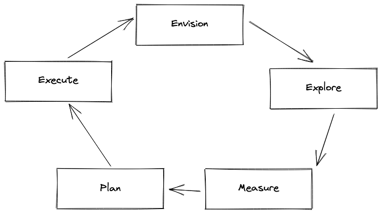 Measurement provides a way to surface the impact of your initiative. It leverages the "Explore" result, but it is ongoing, unlike explore which is a point in time investigation. If the vision is to make deployments safer, a measurement may focus on the current rate of deployment errors, and ensure that the work executed for the vision reduces this number. Measurement is ongoing. Ideally measurement will be automated but if not, metrics should be pulled at an interval sufficiently small enough to track progress (weekly or monthly).