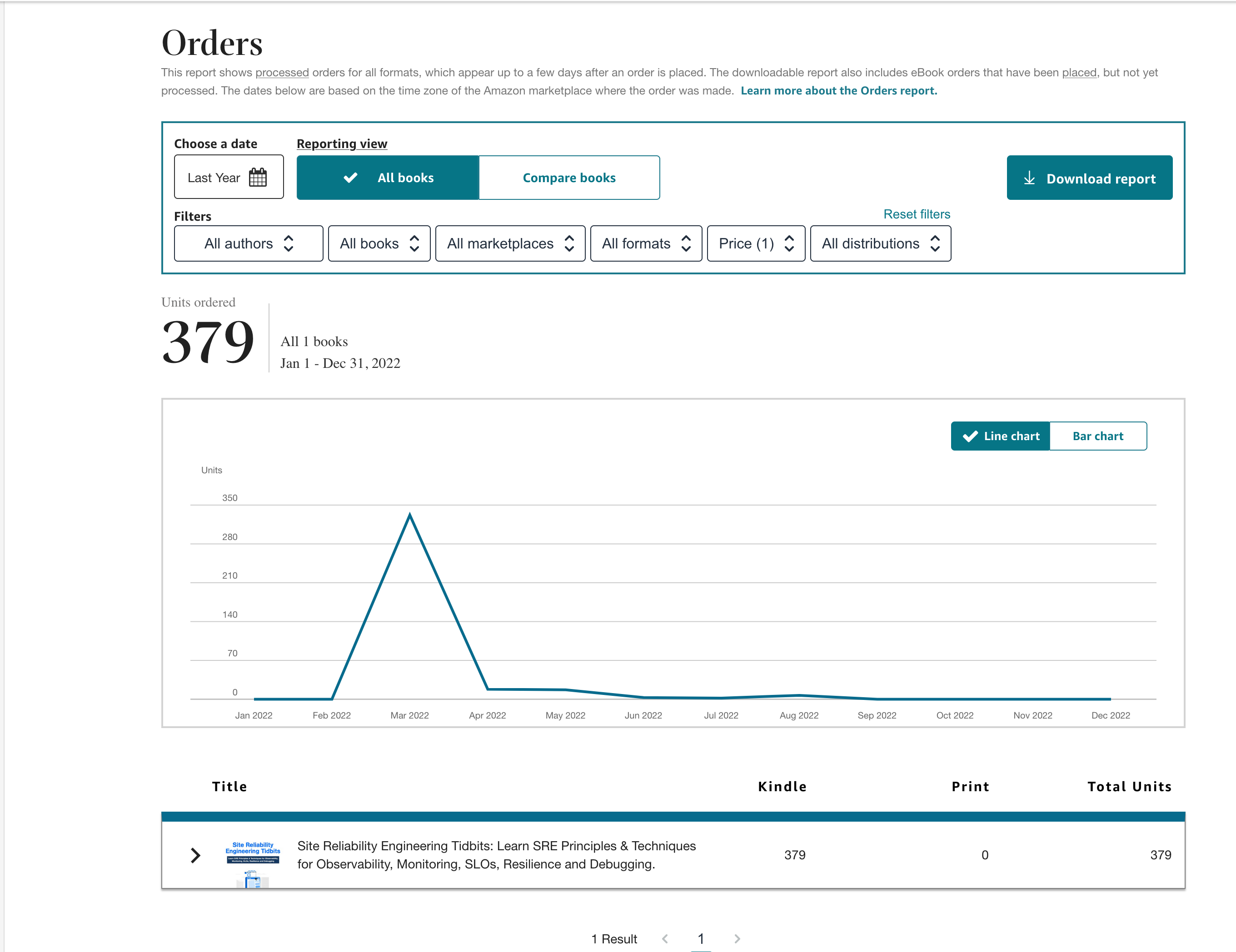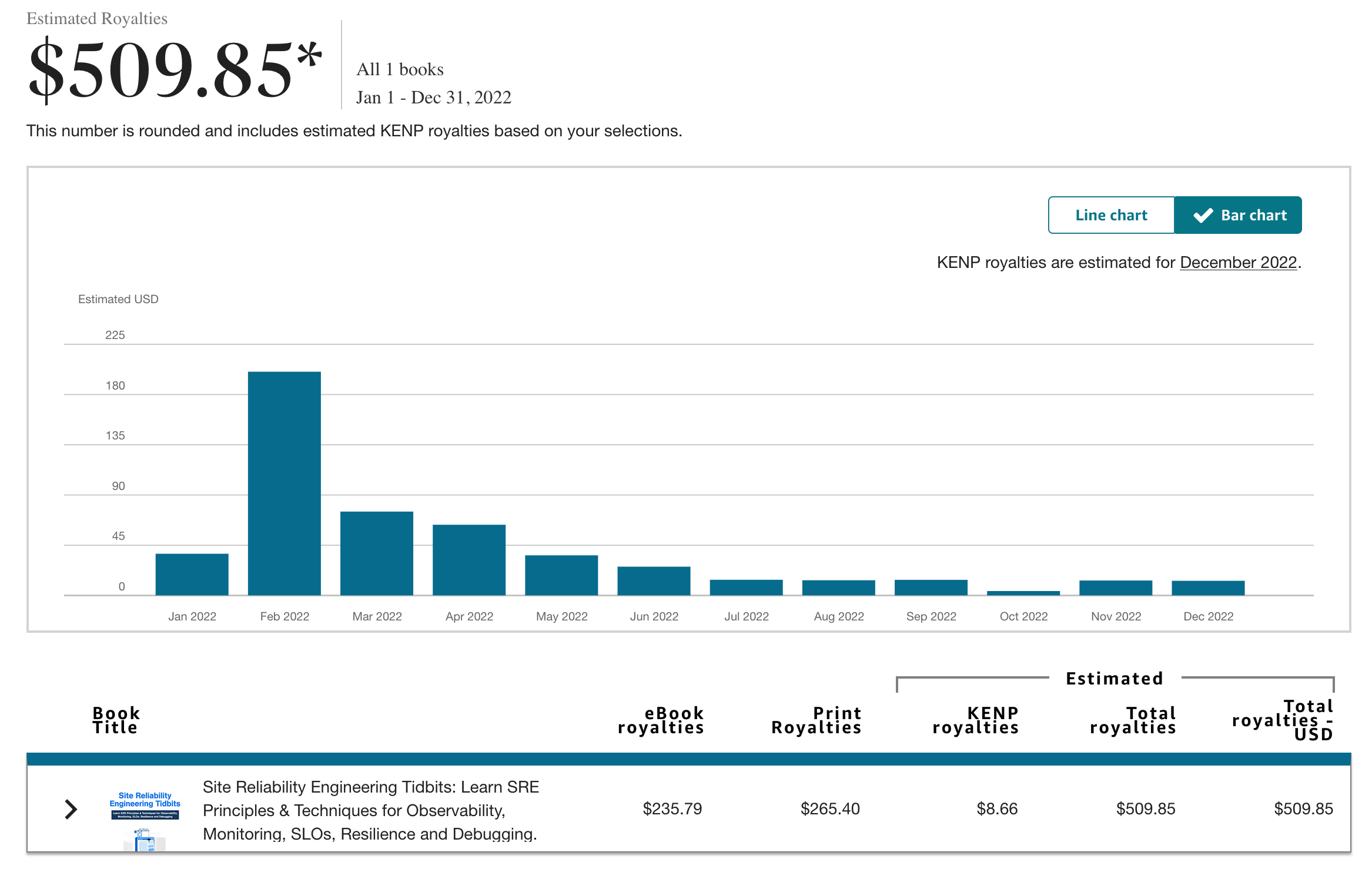Hello! I self published an ebook in early january of 2022. This post documents my 2022 earnings from the book. The book's title is "Site Reliability Engineering Tidbits" it is available on Leanpub and Amazon.