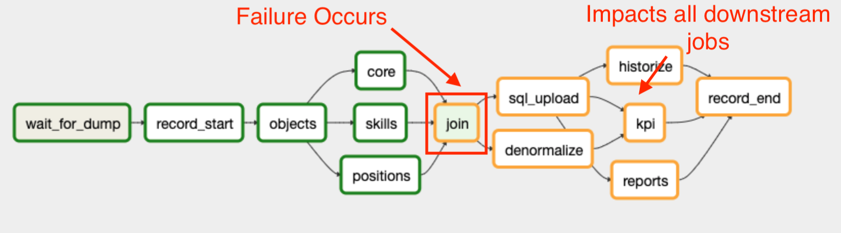 The same goes for refining the raw data on the data lake. If the data team only offers 99% availability of airflow and dbt stages, and has 200 daily jobs that means 2 errors per hour should be expected. Due to the dependency graph nature of SQL model transformations, a failure manifests down the dependency graph, impacting all subsequent processing stages, cascading throughout.