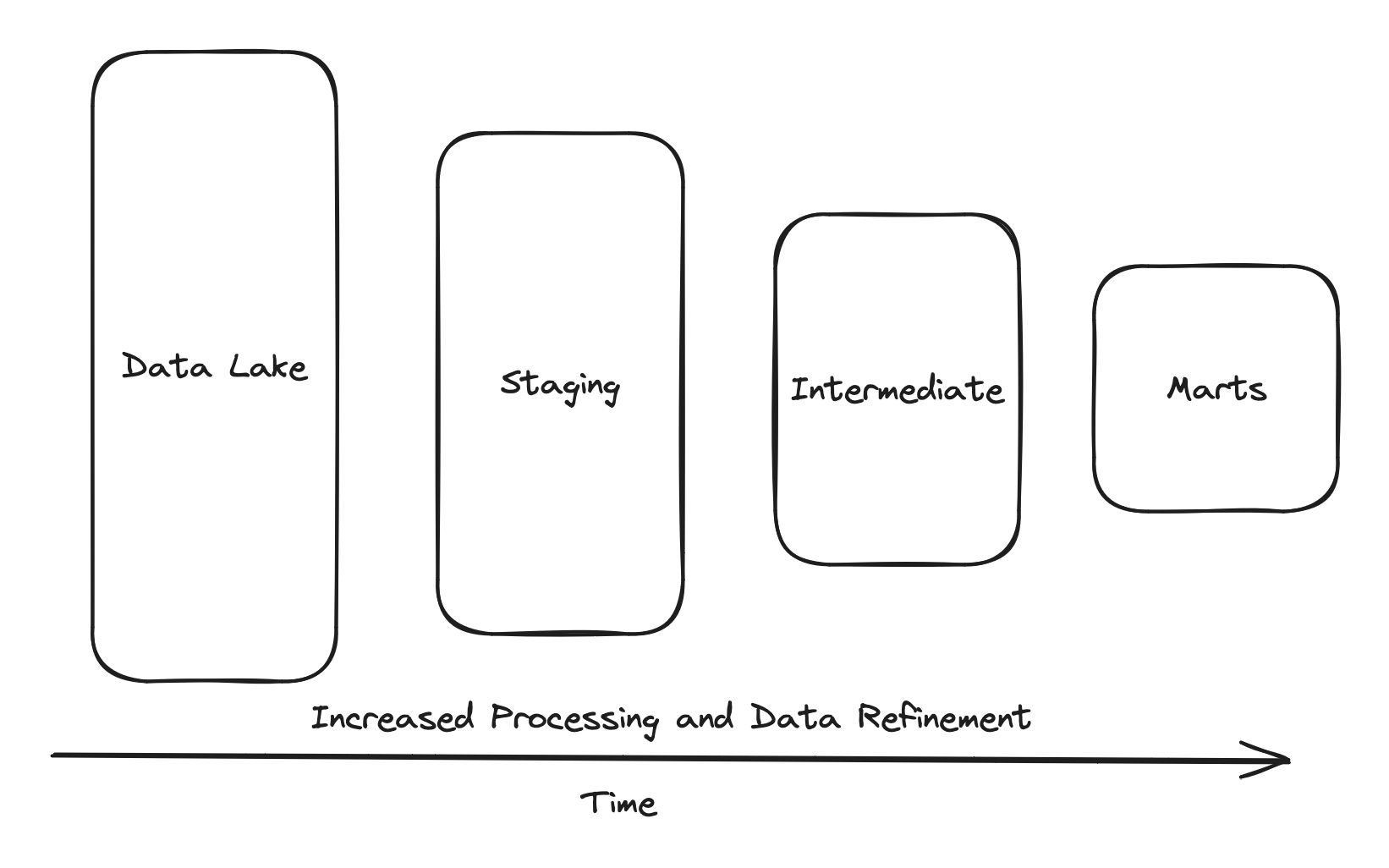 Once in the datalake, data engineering stakeholders have to understand the operational data and refine it into usable metrics. Current best practice suggests metric refinement should be a multi-stage process, each stage imposing more order to the data until insights are finally derrived at the final stage: