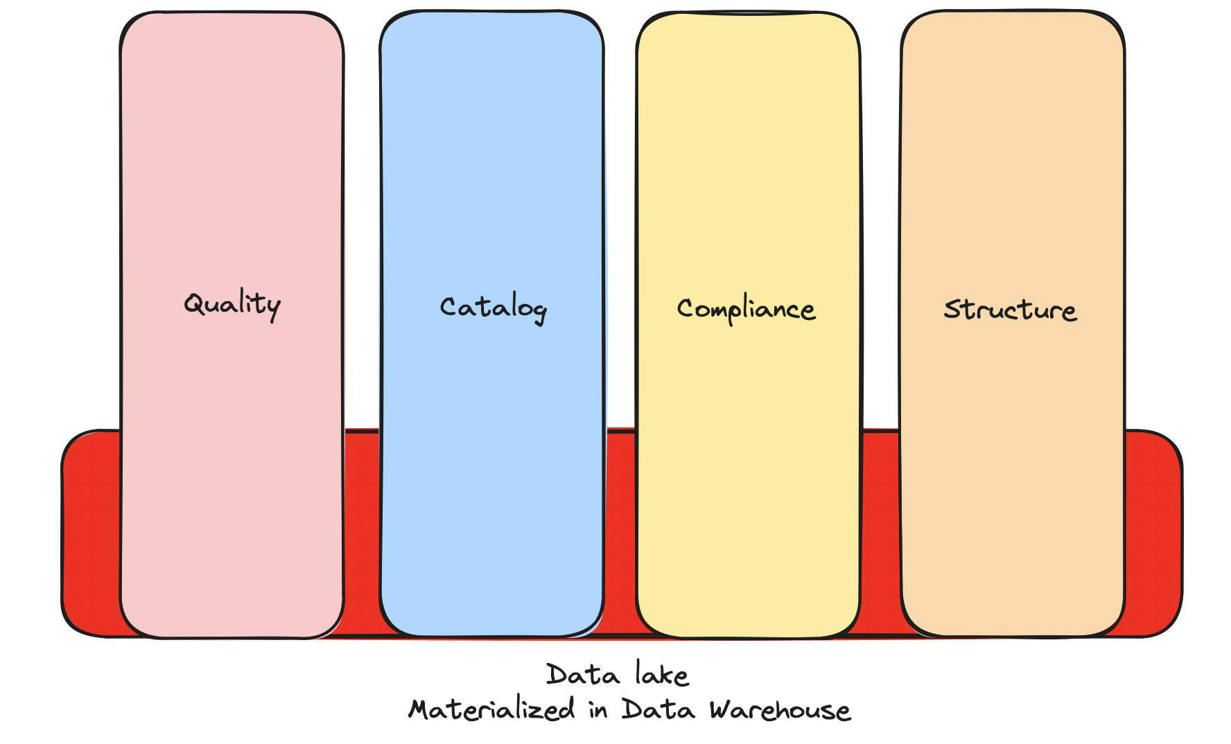 The raw, sometimes unstructured data, living in data lakes necessitate imposing order and structure and other compliance and architectural concerns. These concerns are often layered on by vendors and include: quality offerings, compliance offerings, cataloging offerings and structure offerings.